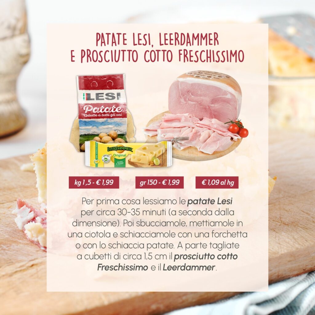 A parte tagliate a cubetti di circa 1,5 cm il prosciutto cotto Freschissimo e il Leerdammer.